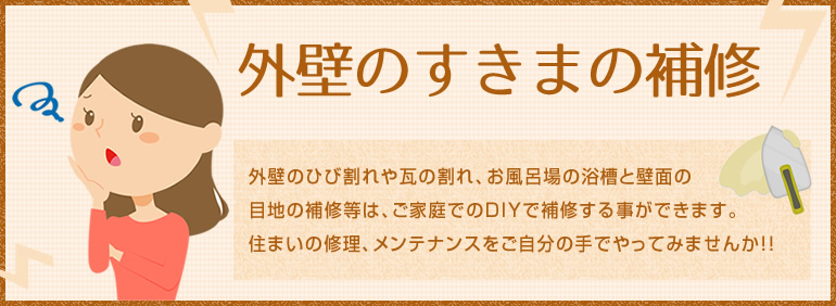 外壁のひび割れや瓦の割れ、お風呂場の浴槽と壁面の目地の補修等は、ご家庭でのDIYで補修する事ができます。住まいの修理、メンテナンスをご自分の手でやってみませんか!!